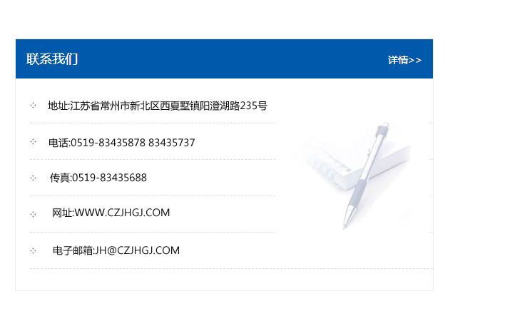 地址:常州市新北區友邦商務大廈1幢16、17層  電話:0519-85101652  傳真:0519-85112595  郵編:213022  網址:www.cz-jiayue_cn.zdsyxh.com  郵箱:xiajifengaa@163.com